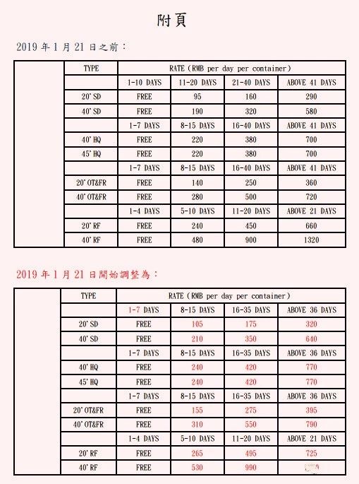 自2019年1月21日開始,將針對所承運(yùn)的上海出口貨柜“自外圍堆場提領(lǐng)空箱日起,至出口重箱完成裝船之開船日止”之集裝箱使用費(fèi)率進(jìn)行調(diào)整。